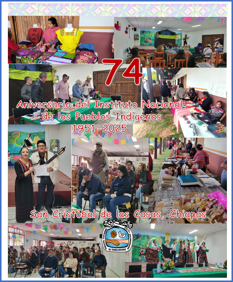En el marco del 74 Aniversario, las y los compañeros del CCPI y la Sección No. 02, de San Cristóbal de las Casas, Chiapas, realizaron actividades tales como encuentro deportivo entre trabajadores, bailables el Tepezcuintle, Biografía de Turula a cargo del grupo de CONAFE, Reseña Institucional , Música tradicional de Tenejapa, Ponencia sobre el “ El Proceso penal frente a los Indígenas, momento de abandonar el enfoque asimilacionista” música tradicional del Tenejapa, ponencia sobre “ Efectos inesperados del Indigenismo en Chiapas”, Teatro Guiñol obra”, Reseña del mural del compañero Martin Octavio Martínez Urbina, Exposición fotográfica, expoventa de productos.